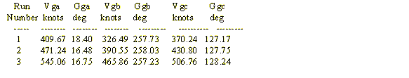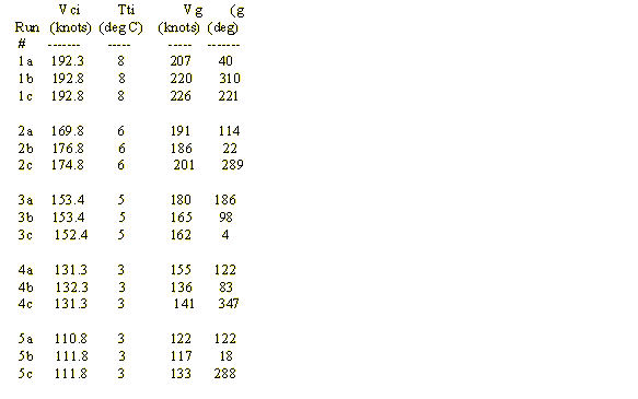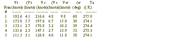 On March 6, 1998, the NTPS flew a set of five multi-track maneuvers on a medium transport aircraft (Merlin III) shown above. Previous tests on the same aircraft were reported in reference 3. In this case, the data were all hand recorded from cockpit instruments and a hand-held GPS unit. The data were read to the nearest knot. The flight pattern was not the cloverleaf pattern used by the AFFTC but a right angle pattern. The first pass was at some heading (1. This was followed by a right hand turn to intercept the path of the first pass at a right angle to a heading of (2. That makes (2 = (1 + 270 degrees. Finally, a third pass is conducted after a right hand turn through an additional 270 degrees. That would make the heading of the third pass ((3) exactly 180 degrees from the first pass at heading of (1. The data were all at an indicated pressure altitude of 8,000 feet. The data were single values, hand recorded, as opposed to the AFFTC data that were averaged at one sample per second over a full minute. From start to end, the total testing time was 40 minutes. The following data were recorded. Instrument corrections were applied to the indicated airspeed. Instrument corrected altitude became 7,990 feet.