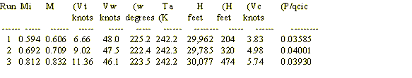 On August 19, 1997 three multi-track runs were performed using the AFFTC F-15 pacer (F-15B USAF S/N 132). A discussion of pacer aircraft can be found in references four and five. These runs were performed at nominal indicated conditions of 30,000 feet pressure altitude and indicated Mach numbers of 0.6, 0.7 and 0.8. Each run consisted of three separate passes at track angles of about 120( apart. In round numbers the first pass was at a track angle of 15( (N-E quadrant). Then a left-hand turn was performed bringing the aircraft around to a track angle of 255( (S-W quadrant). Finally, a second right-hand turn was performed to a track angle of 135( (S-E quadrant). Notice that the headings are separated by the ideal value of 120(. If the data are acquired at roughly equally spaced angles, then the method should produce reasonable results. The NTPS, in fact, has demonstrated that a separation of 90 degrees produces quite adequate results.