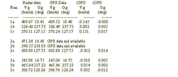This paper will not discuss the theory and operation the GPS system. In addition, it will not discuss air data systems at any length. Both subjects have been written about at length. The references and bibliography contain just a few of the numerous information sources on these topics. For the sake of this paper, the primary piece of information required of GPS is the accuracy of the velocities and at what update rate they are available. The military specification for velocity is 0.10-m/sec (0.19-knot). The data, in this paper, was available at one sample per second. The readability of the civilian GPS used for the NTPS tests was one knot.