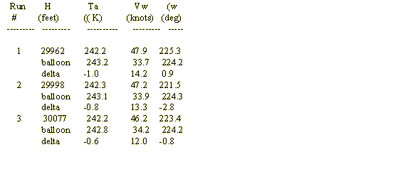 As a check on the data, a comparison was made with weather balloon data. The balloon data were from about two hours after the completion of the last test point. The following table shows a comparison of the balloon data with the aircraft test data.