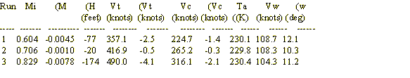 For this particular flight condition, an error in the aircraft parameters equal to their laboratory accuracies would produce errors in Vt of less than 0.1 knot. For the AFFTC data, some of the results will be presented to greater than 0.1-knot resolution, but this does not imply that accuracy level has been achieved.