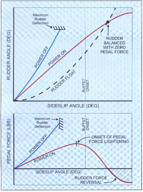 A point is finally reached where the rudder angle required to hold the sideslip angle and the rudder float position are identical. At this point the rudder stays where it is with no pilot force on the pedals. In effect, the rudder is balanced with zero pedal force (Figure 1). The term "rudder lock" is sometimes applied to this point, but this is misleading because the rudder is not actually locked. It does require force on the opposite pedal to return to a normal flight attitude, but the rudder will readily respond to that restoring pedal force.