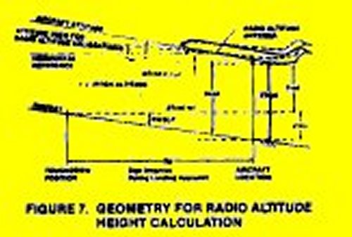 To provide correct height information from radio altitude v4lues requires adjustment for pitch attitude and runway slope. Figure 7 is a graphical presentation of the geometry involved in calculating the height or the aircraft above a horizontal plane through the reference height location using indicated radio altitude. The height is calculated by the following equations: